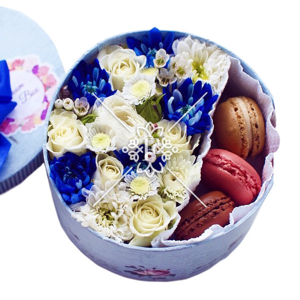 Белый цвет- символ искренних чувств и намерений, представлен здесь  нежными розами и прекрасными хризантемами. Цвет синий - словно вода – глубокий и мудрый. Он символизирует верность любимому человеку, себе, принятым решениям. В сочетании, эти два цвета без слов скажут о яркой индивидуальности того, кому предназначен букет, а макарон приятно порадуют его нотками легкости и хорошего настроения.